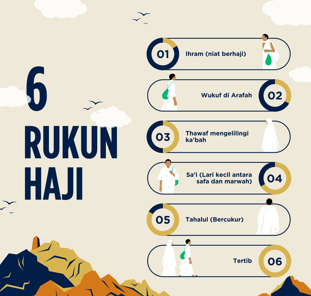 6 Rukun Haji November 16, 2025 jalabhaktitours 12:00 pm Home / Rukun haji adalah rangkaian amalan yang harus dilakukan dalam ibadah haji dan tidak dapat diganti dengan amalan lain, walaupun dengan dam. Jika rukun ini ditinggalkan, ibadah haji seseorang tidak sah. Rukun haji tersebut adalah, Ihram (niat), wukuf di Arafah, tawaf Ifadah, Sa’i, Cukur (Tahallul) […]